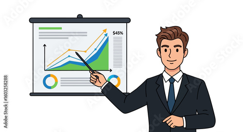 A businessman presenting a successful financial growth chart. This illustration shows a professional analyzing data and market trends for strategic planning.