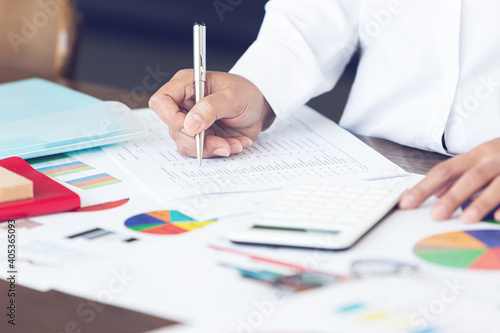 A businessman working at a desk with documents placed in office room