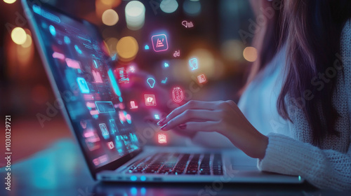 A businesswoman using a laptop with hologram icons, representing a contact us or customer support hotline. The icons include feedback, business, and finance concepts, emphasizing customer engagement a