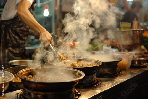 A bustling kitchen with multiple woks steaming with freshly prepared food, The tantalizing aroma of freshly cooked food