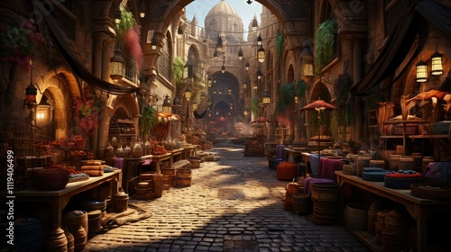 A bustling Moroccan souk with colorful textiles