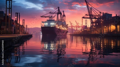 A bustling port at dusk, silhouetted cranes unloading cargo from ships, and a colorful sky reflected in the calm harbor waters.