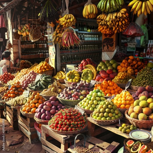 A bustling street market featuring vibrant stalls with an array of exotic fruits and spices, capturing the lively and colorful atmosphere. AI generated image.