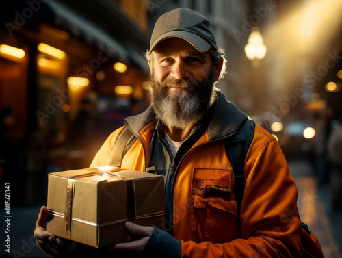 courier, man, delivery man, delivery, safety, package, urban, street, transport, city life, vibrant, parcel, evening, city, logistic, gift, occupation, engagement, presence, business, atmosphere, reveal, cardboard box, labor, excitement, offering, shipment, ai, light, workwear, generative, presenting, handling, commerce, warm tones, glow, conveyer, order, downtown, illustration