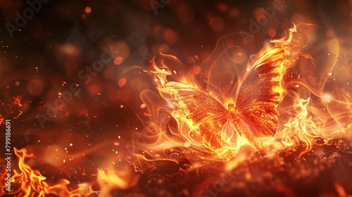 A butterfly is flying through a fire, with its wings glowing in the flames