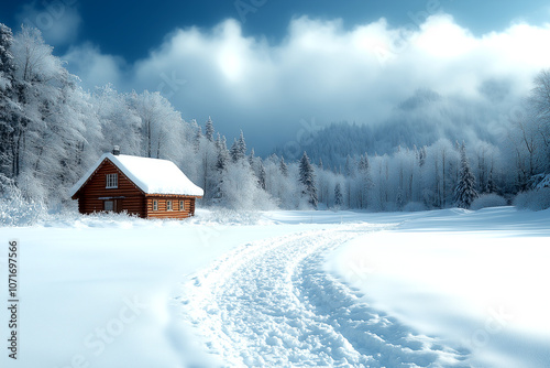 A cabin in the woods is surrounded by snow. The cabin is small and wooden, and it is the only building in the area. The snow-covered landscape creates a peaceful and serene atmosphere
