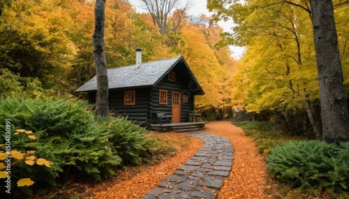 cabin, forest, autumn, tree, fall, nature, landscape, wood, foliage, scenic, rural, wilderness, tranquil, serene, peaceful, idylli, cosy, rustic, exterior, architecture, building, home, house, shelter, timberland, leaf, colourful, gold, red, yellow, orange, brown, environment, season, outdoors, nobody, day, sunlight, clearing, meadow, solitude, remote, escape, get-away, picturesque, vista, autumn leaf, wooden