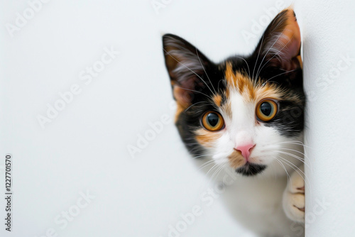 cat, calico, peeking, corner, white, background, curious, felino, pet, whisker, sneaky, playful, hidden, observing, domestic, adorable, mysterious, charming, alert, isolated, minimal, watching, engaging, portrait, cautious, fluffy, colourful, delicate, unique