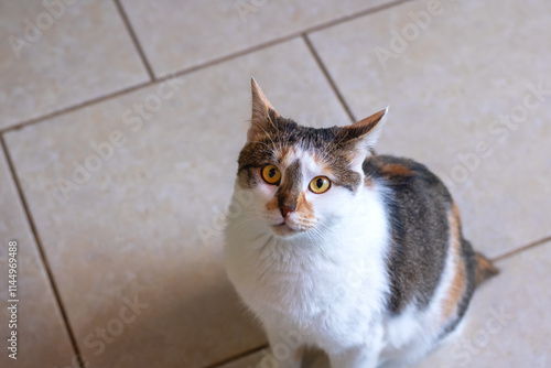 A calico cat with its mouth widely open gazing directly at the camera