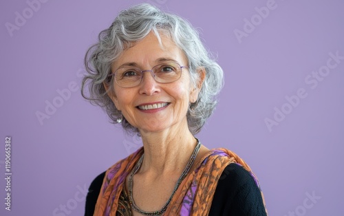 A calm elderly woman smiling gently, with a soft pastel lavender background