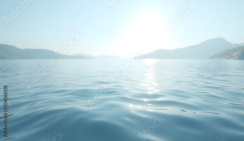 sea, ocean, water, sky, blue, calm, tranquil, sunlight, warm, shimmer, reflect, hue, distant, misty, mountain, gentle, lapping, wave, boat, silhouette, peaceful, serene, landscape, seascape, nature, scenery, beautiful, relaxing, horizon, atmosphere, mood