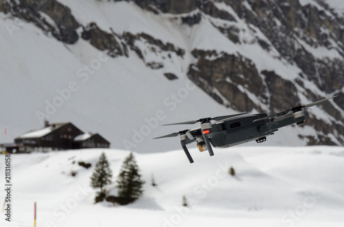 A camera drone hovering and spying over snowy skiing hills in alps