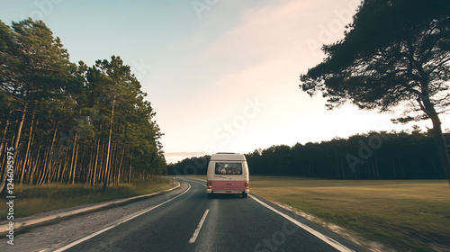 A campervan drives along a scenic road lined with tall pine trees, bathed in the soft light of sunset. Perfect for travel, adventure, and wanderlust themes.