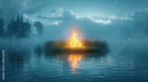 A campfire on a small island in the middle of a lake, with a cloudy sky above.