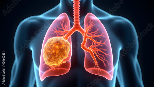 lung cancer, tumour, oncology, glowing, hd, detailed, biology, illustration, photorealistic, shading, texture, black background, medicals, complexity, smoking, advanced, three-dimensional, modelling, metastasis, effusion, biopsy, staging