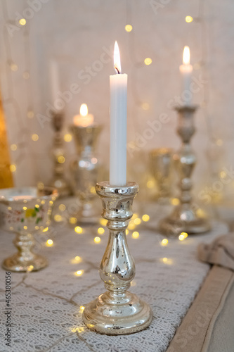 A candle lit at home for Christmas, ancient tin candlestick