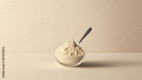 A captivating arrangement of milk powder in a small glass bowl, paired with a shiny stainless steel spoon, is displayed against a smooth white background