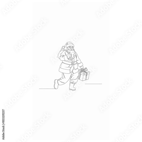 A captivating continuous line drawing depicts a full-body Santa Claus energetically delivering a wrapped gift, perfectly embodying the festive spirit of Christmas.
