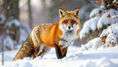 A captivating red fox stands alert in a snowy forest landscape, showcasing its rich fur and piercing gaze.