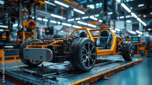 A car chassis on an assembly line in a high-tech factory, representing automotive manufacturing, technology, and industrial production.