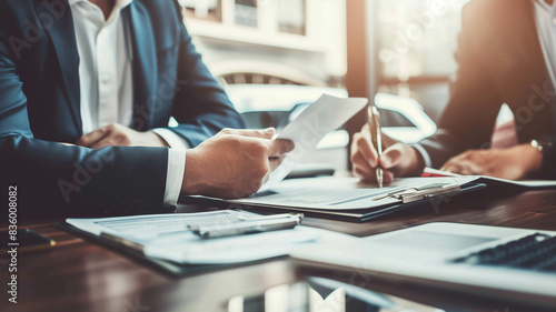 A car dealer and a customer sitting at a desk reviewing a rental vehicle contract, highlighting the paperwork and agreement process. Ai generated