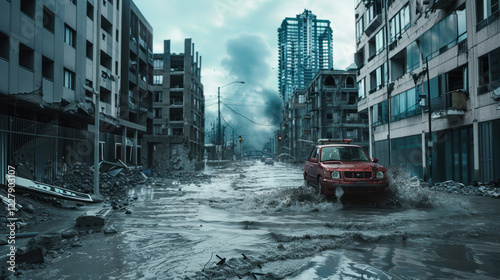 street, city, water, car, murky, red, flood, building, debris, scene, sky, overcast, gloomy, atmosphere, level, high, sense, devastation, realistic, style, essence, post, disaster, urban, environment, city street, red car, at water level
