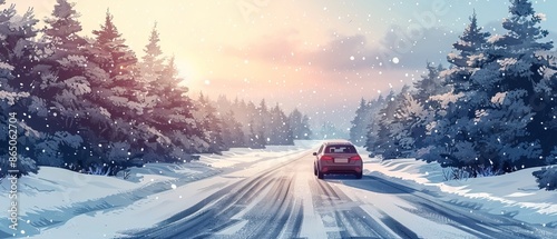 A car driving down a snow-covered road. Suitable for winter driving or scenic road trip concepts