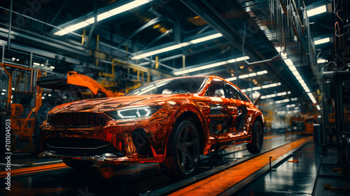 A car is being assembled in a conveer factory. A car being worked on in a factory