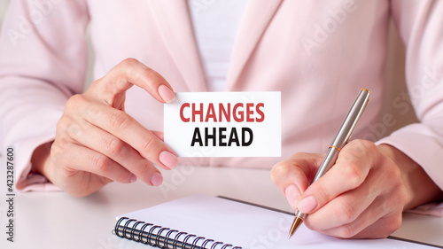 word, hand, woman, card, text, concept, paper, businesswoman, pink, business, work, accountant, accounting, pen, notepad, job, holding, background, change, ahead, suit, message, businessman, leader, manager, career, change, word, success, white, put, red, signs, management, challenge