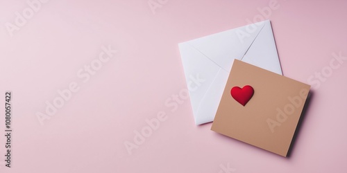 A card with a heart on it sits on top of an envelope. The card is brown and the envelope is white
