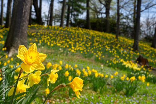 daffodil, flower, bloom, blossom, closeup, detail, carpet, flocked, tree stump, stump, floral, green, yellow, hill, slope, landscaping, field, garden, botanical, many, morning, narcissus, tree, trunk, old, nature, environment, spring, season, april, profusion, sunlight, sky, blue, beauty, beautiful, nobody, horizontal, flora, cleveland, ohio, america, us