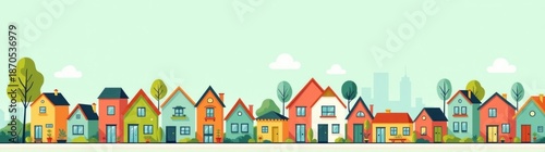 A cartoon city with a row of houses and trees
