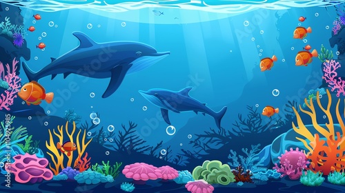 A cartoon illustration of a colorful underwater scene with dolphins and fish.