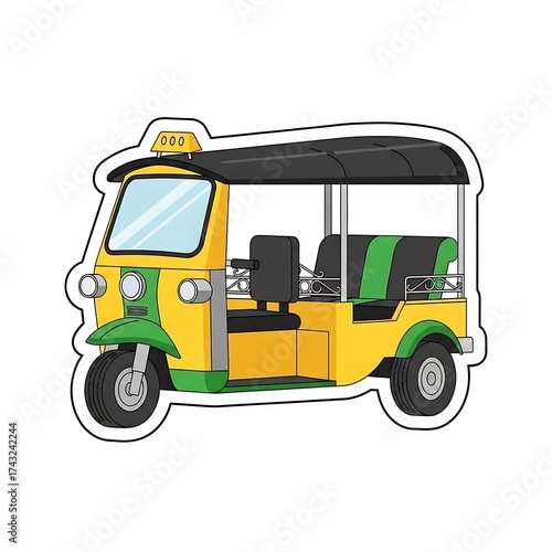 cartoon, yellow, green, black, roof, seat, striped, vehicle, transportation, asia, travel, illustration, taxi, rickshaw, design, isolated, thai