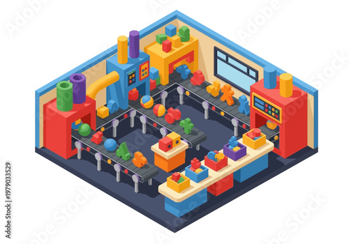 A cartoon isometric illustration of a toy factory production line creating colorful plastic toys