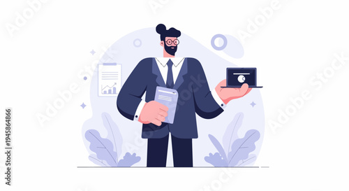 man, suit, laptop, document, holding, standing, cartoon, illustration, flat, design, abstract, shape, plant, leaf, background, modern, simple, minimalist, clean, professional, business, concept, presentation, datum, strategy, technology, digital, device, office, work, job, career, confident, smart, thoughtful, creative, graphic, art, vector, character, person, male, formal, attaching