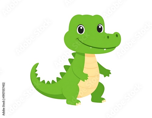 A cartoon-style illustration of a cheerful green crocodile, standing and smiling with large, friendly eyes against a white background
