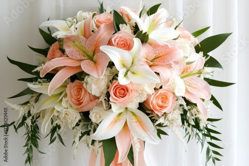 A cascading bouquet of lilies and roses arranged for a wedding, with satin ribbons tying it together