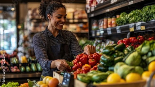 cashier, grocery, store, produce, client, interaction, shopping, life events, seamless, checkout, fresh, food, retail, service, friendly, transaction, engagement, market, community, local, organic, value, convenience, vibrant, teamwork, satisfaction, lifestyle, essential, supply, warm, atmosphere, professionalism, support, quality, health, fresh produce, commerce, social, connection, happiness, smiling, routine, sale, fruit, vegetable, service industry