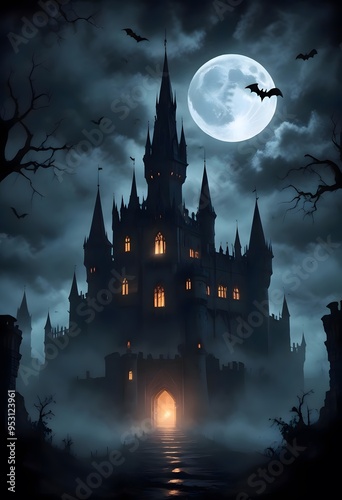 A castle against a night sky & large full moon, Bats, clouds,Happy Halloween trick or treat, poster