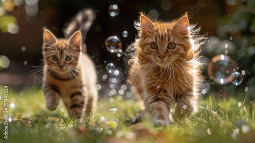 A cat and dog chasing bubbles blown by their owner in a sunny garden.