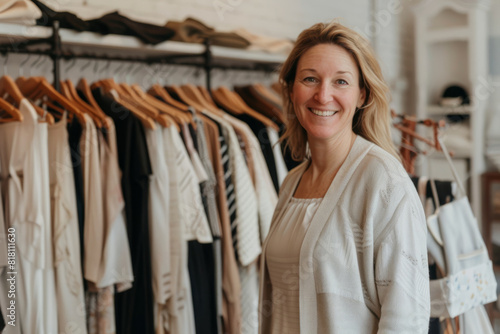 A Caucasian fashionista with an eye for timeless elegance and understated luxury, curating a carefully curated selection of classic wardrobe staples and sophisticated statement pieces in her chic