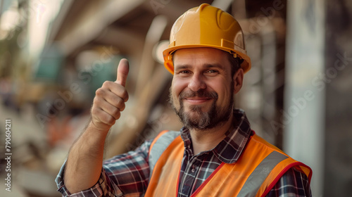 A Caucasian male construction worker in a hard hat gives a thumbs up against the background of a building under construction. The concept of safety at the construction site. Work in construction.