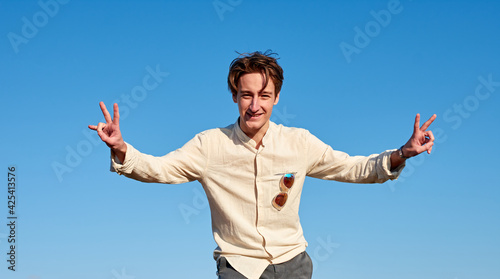 A Caucasian man from Spain making victory signs with both hands on clear sky background