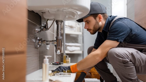 A caucasian man plumber fixing a sink under the counter in a modern bathroom using tools. Home maintenance and repair service concept.