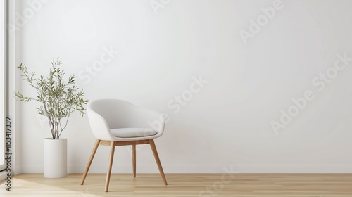 A chair with wooden legs in a modern minimalist interior, wooden vinyl flooring, and a clean white wall