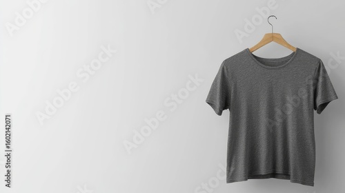 A charcoal grey, short-sleeved t-shirt hangs on a simple wooden hanger against a stark white wall, providing a clean, minimalist backdrop ideal for showcasing apparel designs or branding