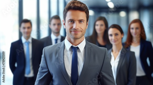 A charismatic business leader standing ahead of his cheerful team in a corporate office environment AI generated