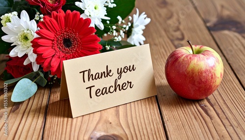 A charming bouquet of flowers with a 'Thank You, Teacher' card gracefully displayed in front, accompanied by a fresh apple