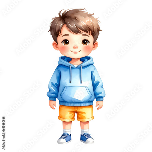 boy, children, children, cartoon, illustration, happy, smiling, cute, adorable, young, person, male, character, fun, cheerful, joy, innocent, friendly, playful, hair, brown, eye, face, expression, body, pose, standing, outfit, clothing, hoodie, blue, short, yellow, shoe, sneaker, style, fashion, design, art, graphic, drawing, watercolor, digital, isolated, white, background, portrait, full, length